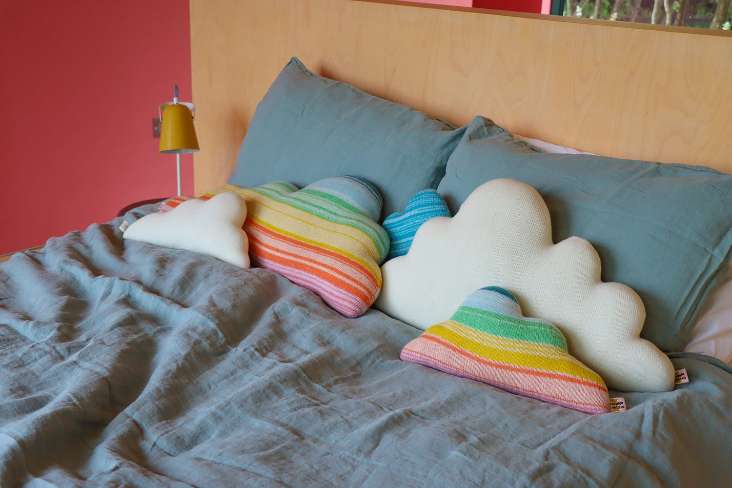 Cuddle up with a Cloud Cushion! We’ve knitted a limited edition rainbow colourway of our signature Cloud Cushions to add a little colour to your home.