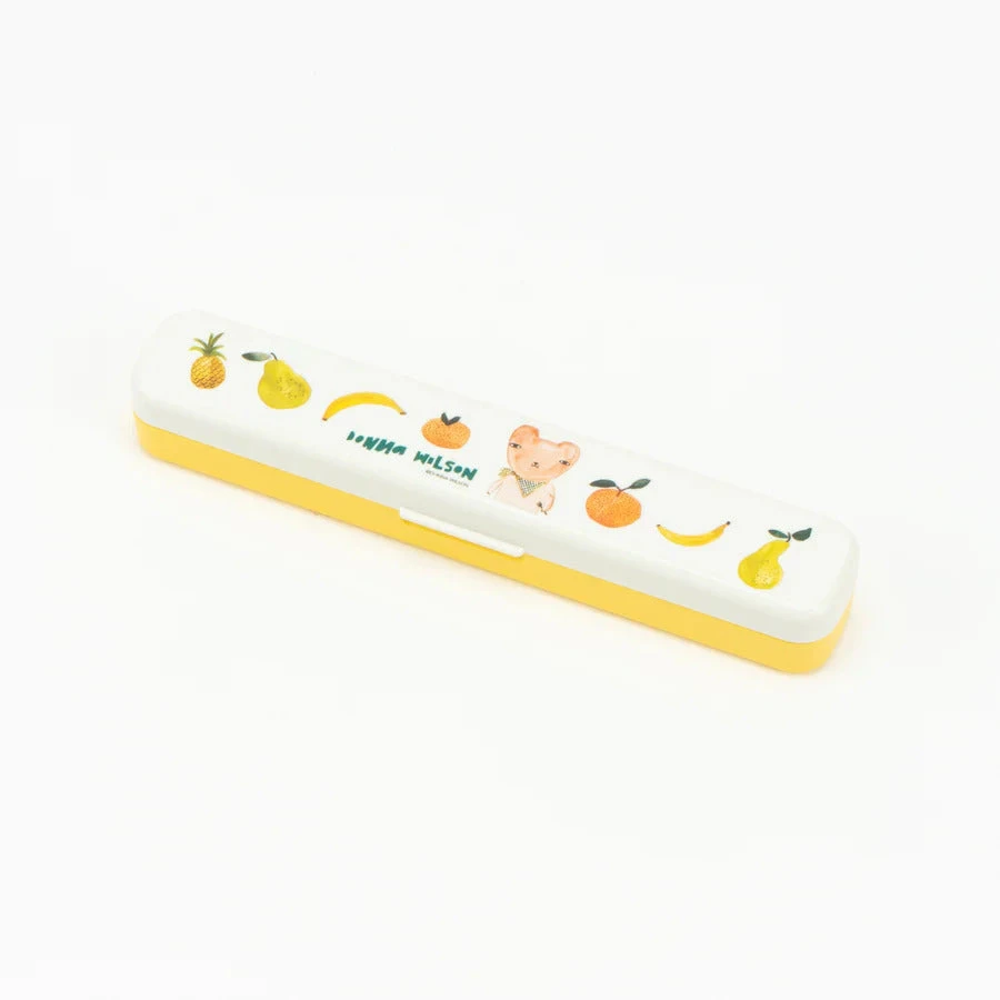 The case features a watercolour illustration of a friendly, fruit loving-bear, while the fork and spoon are both decorated with a Donna Wilson logo. The carry case is lined with silicone so the cutlery won’t rattle around in your bag!